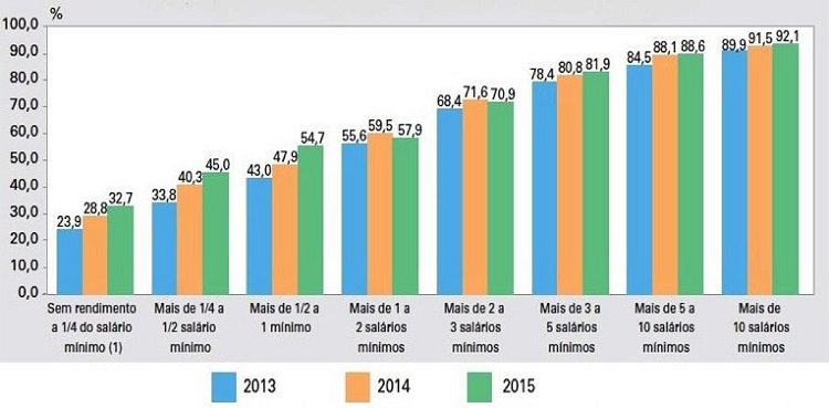 Embora, conforme o Gráfico 6, secundado pelo Gráfico 5, exista uma severa desigualdade entre os estratos de renda quanto ao acesso regular à internet, entre os anos de 2013 e 2015, o crescimento relativo mais elevado ocorreu nos estratos domiciliares de menor renda. Em 2013, 23,9% dos estratos domiciliares não possuíam rendimento ou seu rendimento era de ¼ do salário mínimo (cerca de R$ 169.5); em 2015, esse percentual se elevou para 32,7%. O crescimento mais significativo ocorreu no estrato de renda domiciliar seguinte. Em 2013, 33,8% dos domicílios com renda mensal entre ¼ e ½ salário mínimo acessaram regularmente a internet, esse percentual subiu para 45,0% em 2015, um crescimento de 35% em dois anos. No estrato domiciliar seguinte, que aufere uma renda de ½ a um salário mínimo, em 2013, 43,0% dos seus membros acessavam regularmente a internet, percentual que subiu para 54,7% em 2015.