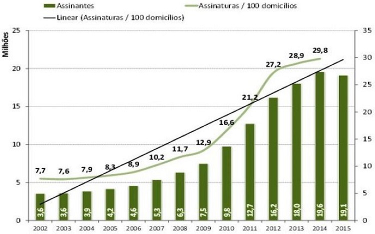 O vetor do mercado audiovisual TV por assinatura foi um dos que mais cresceram no mundo entre 2007 e 2017. Especialmente no Brasil, esse crescimento foi exponencial. Em 2009, o Brasil possuía 7,5 milhões de assinantes de TV por assinatura, abarcando cerca de 22 milhões de pessoas, uma vez que, de acordo com o IBGE, o Brasil abriga, em média, 3 pessoas por domicílio. Seis anos depois, em 2015, o total de assinantes de TV por assinatura subiu para 19,1 milhões, alcançando 60 milhões de pessoas, cerca de 30% da população brasileira. Ou seja, em seis anos, o contingente de assinaturas dobrou no Brasil. O pináculo desse crescimento ocorreu em 2015, quando a base de assinantes no Brasil alcançou 19,6 milhões de assinaturas domiciliares, alcançando quase 30 milhões de pessoas. Em razão da concentração sócio-histórica das atividades econômicas, da distribuição da renda nacional e também da demasiada concentração das oportunidades profissionais, no final de 2015 a região Sudeste abrigava 42% da base geral de assinaturas.