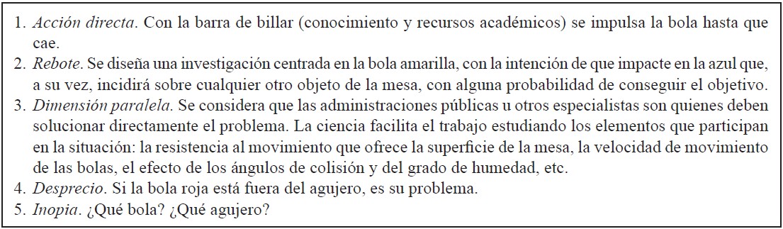 En Manzano-Arrondo (2014) se recurre a una metáfora para describir las diferentes posturas que adopta la acotación científica a la hora de abordar problemas reales: cómo se contempla la necesidad de que una bola roja entre por uno de los agujeros de una mesa de billar, contemplando la existencia de más bolas y una reglas de juego: