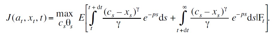 La solución óptima del problema del vendedor ambulante de la maximización de (6) sujeto a sus restricciones presupuestales (4) y (5) se obtiene con programación dinámica estocástica en tiempo continuo. Para ello se define la siguiente función valor (o función de utilidad indirecta):