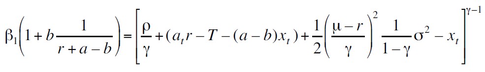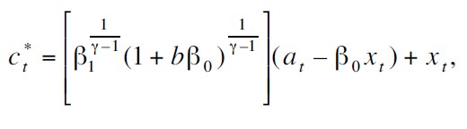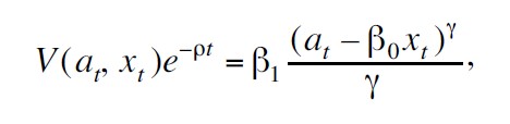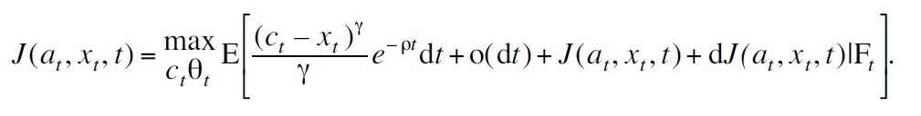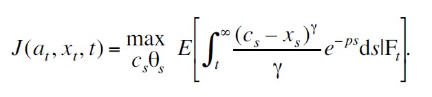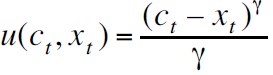 γ ≠ 0 está relacionado con la aversión al riesgo individual, xt representa el nivel de hábito del bien, Ft es la información disponible al tiempo t y ρ es la tasa subjetiva de descuento, esta tasa es un indicador de que tan ansioso está el vendedor por su consumo presente.[5] Una cantidad relevante en esta investigación es el consumo excedente al de subsistencia, ct – xt , el cual está relacionado con el consumo realizado anteriormente.