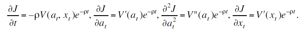 anterior a J(at, xt, t) = V (at, xt) e–ρt . Para este candidato se calculan las derivadas parciales,