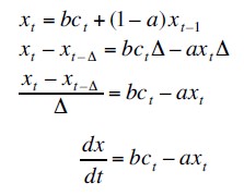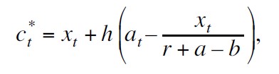 Es constante en el tiempo. Este resultado muestra la trayectoria óptima de lo que el vendedor consumirá en el futuro para satisfacer sus necesidades básicas de sobrevivencia. Observe que el consumo del individuo tiene que ser por lo menos xt . El factor h representa la propensión marginal al consumo después del consumo de subsistencia.