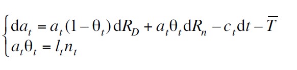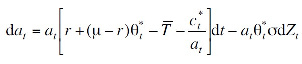 La acumulación de la riqueza en términos de los depósitos, el ingreso y el consumo está dada por la siguiente ecuación diferencial estocástica: