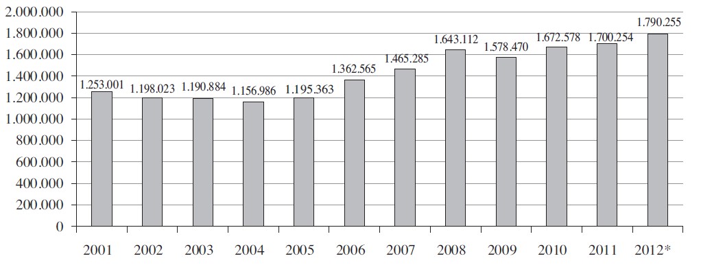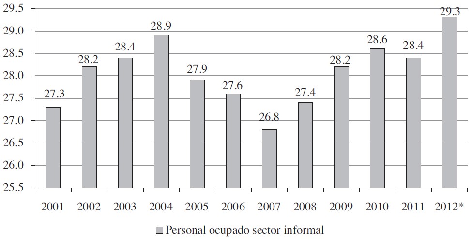 En junio de 2012, en México existía una tasa de desempleo que no superaba el 5% de la Población Económicamente Activa (pea). La población de aquellos que trabajan menos de 35 horas semanales y obtienen hasta dos salarios mínimos tuvo un incremento del 12.39% con respecto del año anterior. Asimismo, la población que labora en el sector informal de la economía asciende a 14.2 millones de personas, lo cual representa el 29.3% de la población ocupada (según la enoe del inegi 2012) habiendo aumentado en 830 mil personas con respecto al dato del año anterior. En la gráfica 1 se muestra la evolución del personal ocupado en el sector informal de 2000 al 2012. Se observa que en 2004 se dio un incremento considerable del 28.9%, lo mismo ocurre en 2010 con 28.6% y en 2012 con un 29.3%. Asimismo se observa una disminución considerable en 2007 con un 26.8%.