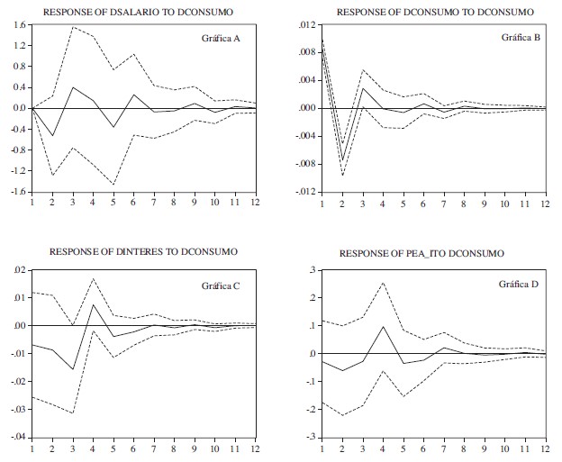 encuentra en equilibrio de largo plazo. Por otro lado, se debe considerar la longitud del cambio, ya que si este se considera muy corto no se puede observar con precisión la evolución de la estabilidad dinámica del VAR. De esta manera, si el VAR es estable, una perturbación hará que el sistema salga de su trayectoria de equilibrio, aunque después de algunos periodos vuelva al equilibrio. Los análisis del presente estudio se basan en un intervalo de un año a fin de observar el proceso de cambios y ajuste de manera completa. Aunque el proceso impulso-respuesta genera cuatro análisis (todas las variables contra todas); únicamente se examina el impulso de las cuatro variables sobre el consumo.