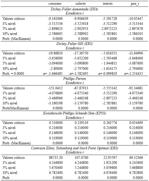Para analizar las relaciones entre dos o más variables es común ver si los procesos estocásticos que generan las series de tiempo son estacionarios. Se requiere que las series carezcan de raíces unitarias. La prueba más común sobre raíces unitarias es la Dickey-Fuller Aumentada (ADF), pero para hacer robusto el estudio se utilizaron otras pruebas disponibles: Dickey-Fuller GIS, Phillips-Perron, Kwiatkowski-Phillips-Schimidt-Shin (KPSS) y Elliot-Rothenberg-Stock, las cuales son mostradas en el Cuadro 1 en el que se observa que los resultados de las pruebas mencionadas anteriormente para las series de consumo, salario, interés y pea_i son estacionarias en primeras diferencias.