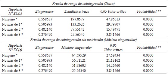 Al aplicar la prueba de Johansen, los resultados son favorables. Por un lado, el estadístico de la traza es mayor que los valores críticos a un nivel de 5% de significancia, por lo que se rechaza la hipótesis nula de la existencia de vectores cointegrantes y, por otro lado, la prueba del máximo eingenvalor posee conclusiones similares a las de la prueba de la traza.