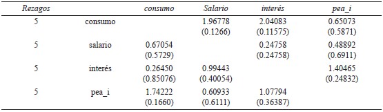 nivel de 5%, por ello se rechaza la no existencia de vectores de cointegración, y se confirma, según el eingenvalor, que no hay más de un vector de cointegración. De acuerdo con la prueba de Johansen, el consumo, salario, tasa de interés interés y la pea_i mantienen una relación de equilibrio a largo plazo entre ellas.