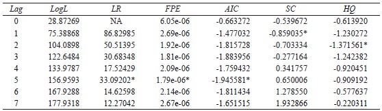 variables; sólo si presenta el mismo orden de integración se contará con información histórica relevante. Un factor importante del análisis VAR es el número de rezagos a emplearse, por lo que es necesario evaluar uno a uno cada rezago hasta encontrar el número óptimo. Con tal propósito es indispensable contrastar los criterios de información estadística que genera cada especificación. En esta investigación se utilizan los criterios de Akaike y Schwarz que, en general, son muy parecidos, pero ocasionalmente pueden dar resultados distintos. En este caso se toma el criterio que ofrezca menos rezagos. Esto debido a que un incremento de rezagos disminuye R2 .