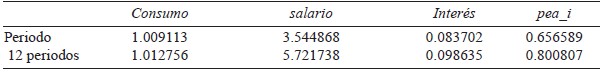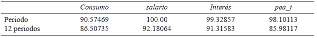 La descomposición de la varianza es un estudio complementario al análisis impulsorespuesta que proporciona en distintos periodos de tiempo el porcentaje de volatilidad que registra una variable por los choques de las demás. De esta manera es posible medir la volatilidad que genera la variable endógena a la variable exógena en un momento específico. En el cuadro 5 se resumen los resultados para el primer y doceavo periodo. Se observa que todas las variables tienen un fuerte comportamiento autorregresivo, estos en virtud de que después de 12 meses más de 90% de la varianza de cada variable se sigue explicando por sí misma, excepto el consumo con el 86% y la población económicamente activa ocupada en el sector informal con el 85%.