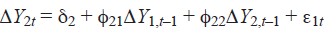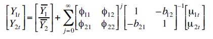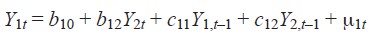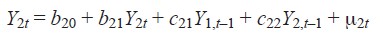 de ella misma y de las restantes variables incluidas. Cada variable regresando comparte el mismo grupo de variables regresoras. Esto permite interpretar la representación VAR como la forma reducida de un modelo estructural de ecuaciones simultaneas. Para la representación anterior el modelo estructural correspondiente es: