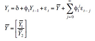 Esta representación permite analizar la interacción entre las series. Los coeficientes φik que componen cada una de las matrices pueden utilizarse para generar los efectos de m1 ty m2 t sobre las trayectorias temporales de Y1 t e Y2 t . Estos coeficientes son los multiplicadores del sistema y sus representaciones gráficas constituyen las funciones de impulso-respuesta.