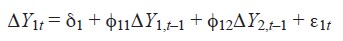 de error. Dado entonces que Y1,t–1; Y2,t–1 están cointegradas la combinación en el paréntesis será I (0,) aun cuando sus predecesoras no lo eran. Una vez planteada esta corrección los procedimientos de mínimos cuadrados e inferencia estadística vuelven a ser válidos.
