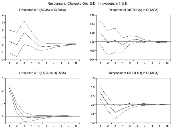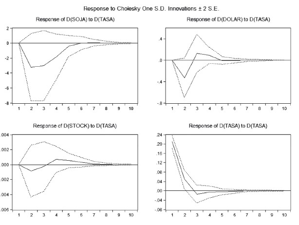 Finalmente se realizan los correspondientes shocks de interés mediante las funciones de impulso respuesta. Se pretende estudiar la respuesta ante un cambio en la tasa de interés en la cotización del precio de la soya para poder comparar con el periodo previo (1990-2003).