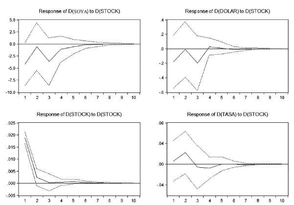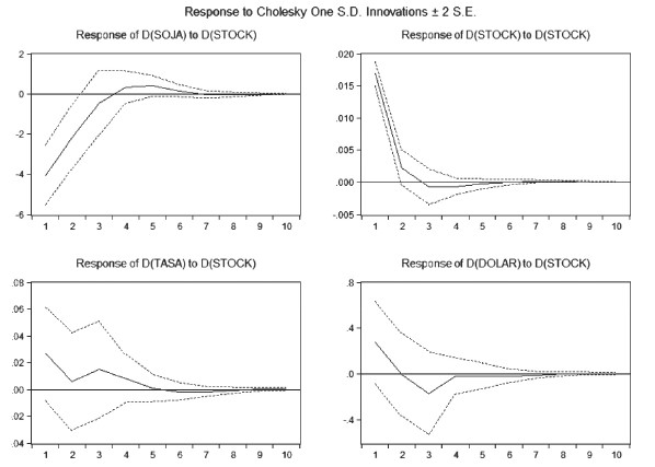 Se observa que un shock en una desviación estándar en los stocks tiene un impacto negativo en los precios de la soya tal como se espera ex-ante. El impacto más importante se produce al primer mes y para el cuarto mes el efecto desaparece. Esto tiene sentido ya que el USDA va revisando su estimación mes a mes y los efectos de un cambio en la estimación presentan poca persistencia para el cuarto mes cuando ya se cuenta con tres nuevas estimaciones. La consistencia de este resultado brinda una confirmación a la validez del modelo especificado.