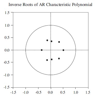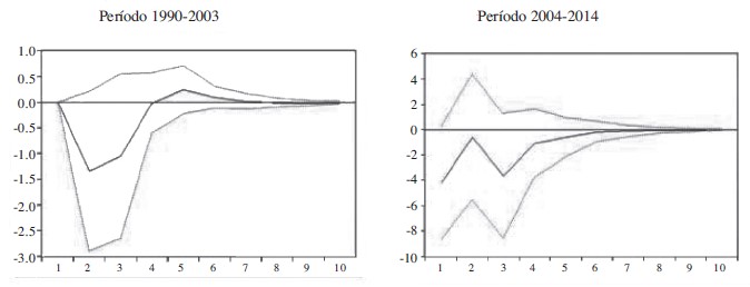 Al igual que en el periodo anterior todas las raíces del polinomio característico son menores a 1 en valor absoluto por lo cual el VAR es estable para el periodo 2004-2014.