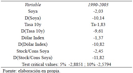 Tal como se mostró en secciones anteriores se parte de los determinantes estudiados por la literatura para especificar el modelo. Se eligen como variables la tasa de interés americana, la cotización del dólar y la relación stock/consumo de frijol de soya. Si bien el foco del trabajo se centra en el estudio del efecto de los cambios de la tasa de interés en los precios, es necesario controlar dentro del modelo los efectos en los cambios en los stocks y de la cotización del dólar a los fines de aislar la influencia específica de la tasa de interés.