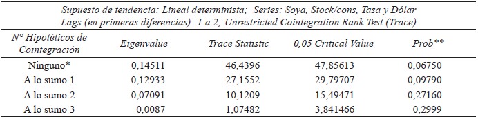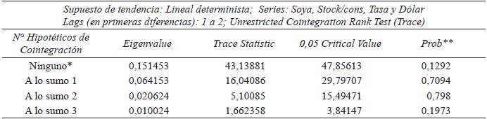 El test Trace indica que no hay ecuación de Cointegración al nivel del 0,05