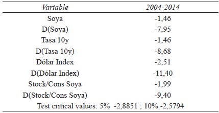 Para el periodo 2004-2014 todos los test de raíz unitaria arrojan los resultados esperados. No se rechaza la hipótesis nula para la variable en niveles y por lo tanto presentan raíz unitaria. La primera diferencia, tal como se espera, no presenta raíz unitaria.