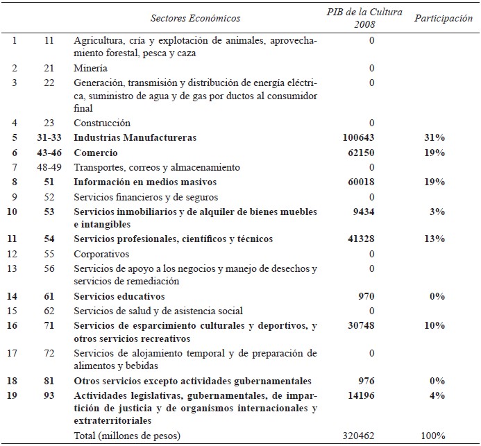 Por otra parte, se destaca que la producción cultural se identifica en nueve sectores económicos, de los cuales cinco concentran el 73% del gasto cultural y son: las industrias manufactureras (25%), información de medios masivos (16%), comercio (15%), servicios profesionales, científicos y técnicos (9%) y servicios de esparcimiento, culturales y deportivos (7.6%). Asimismo esta estructura de participación ha sido muy estable en el periodo 2008-2012. Existen un conjunto de actividades no clasificadas en los sectores económicos que representan el 20% aproximadamente del pib Cultural. Por otra parte, la tasa de crecimiento del pib de la Cultura en el periodo 2008-2012 es cercana al 5% y muy estable, con excepción del año 2009, en el cual se registró una disminución del 6%, acorde con el descenso de la actividad económica nacional del 4.7%.