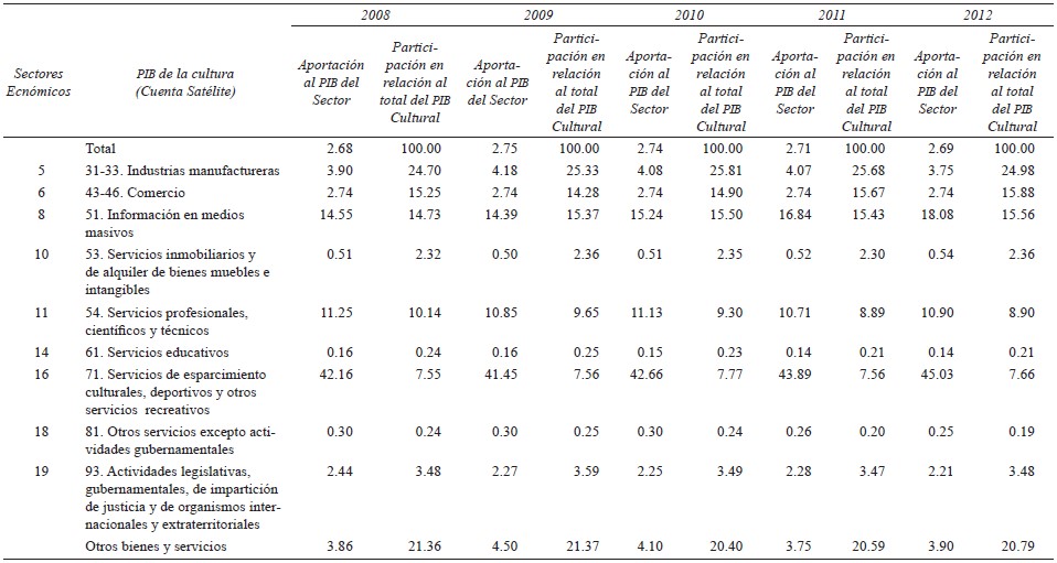 La aportación global de las actividades culturales a la economía ha sido muy similar en el periodo 2008-2012 alrededor de 2.7% del pib. La contribución de las actividades culturales a los diversos sectores económicos que permean de forma transversal la cultura, muestra que es el sector 71 de servicios de esparcimiento, culturales, deportivos el que más contribuye al pib del sector alrededor del 43% en el periodo 2008-2012. Este dato nos dice que se trata del sector económico con mayor definición cultural.