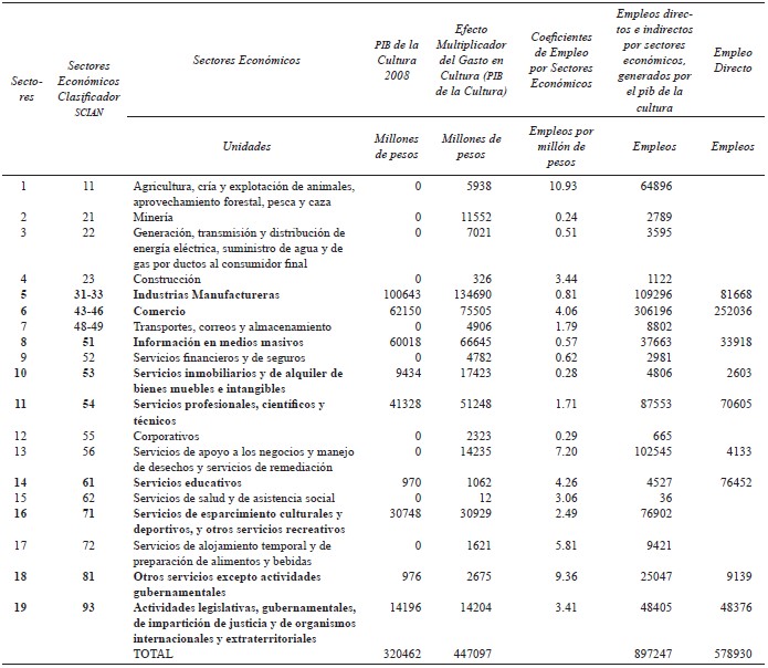 En este apartado, se realizan las estimaciones empíricas que sustentan la importancia económica del sector de la cultura. En primer lugar, se cuantifica el efecto multiplicador de la demanda final, representada por el pib cultural para el año 2008, sobre la producción, el empleo y los salarios. En segundo lugar, se construyen indicadores agregados, tales como coeficientes de empleo y salarios para el sector cultural. Esta valoración agregada permite realizar análisis comparado a nivel nacional y sectorial de dichos coeficientes, con los sectores económicos que integran la matriz insumo producto; y, por último se estiman los multiplicadores de los sectores económicos y se contrastan con el multiplicador del sector cultural, para identificar los sectores de mayor impacto económico sectorial.