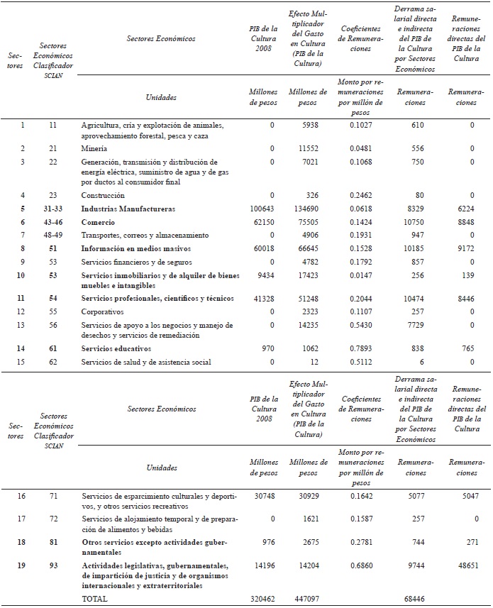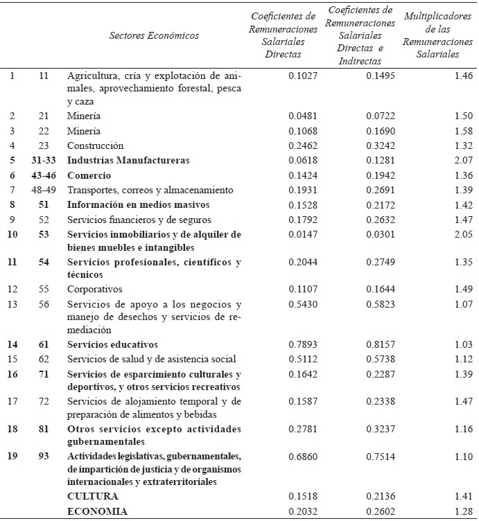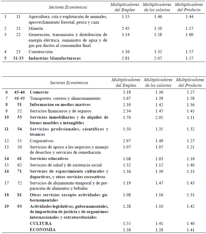 En relación a los multiplicadores del empleo destacan los sectores: generación de energía eléctrica, industrias manufactureras, información en medios masivos y corporativos. Por otra parte, los que tienen un multiplicador mayor en las remuneraciones salariales son: industrias manufactureras y servicios inmobiliarios y de alquiler. Por su parte, la cultura tiene un multiplicador del empleo y las remuneraciones superior al multiplicador global de la economía mexicana.