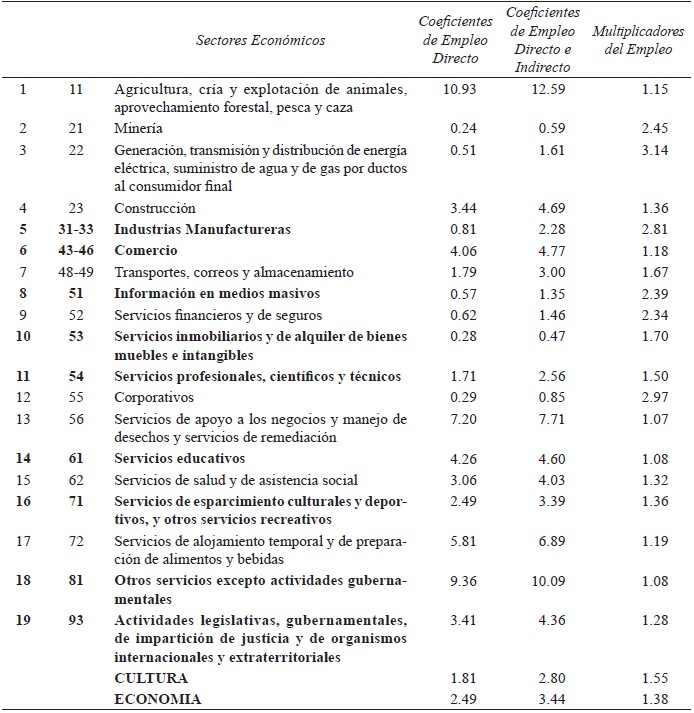 La estimación de los coeficientes de empleo que, de forma agregada, se construyeron para el sector de la cultura y la economía mexicana nos indica que por cada millón de pesos que se invierta en el sector de la cultura se generan 2.8 empleos directos e indirectos, de los cuales 1.81 son empleos directos. Por sectores económicos destacan la agricultura, el comercio, la construcción, otros servicios, los servicios de alojamiento, alimentos y bebidas, estos sectores se ubican por encima del coeficiente de empleo medio para la economía nacional de 2.49.