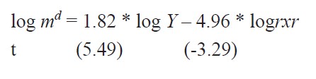 Donde md significa demanda de importaciones de gasolina en dólares corrientes; Y significa pib en dólares corrientes; rxr índice del tipo de cambio real (1998=100). La elasticidad ingreso de la demanda de importaciones (1.82) señala que un incremento del uno por ciento en el ingreso nacional llevaría a un crecimiento de la demanda en 1.82%. Mientras que la elasticidad precio de la demanda de importaciones (-4.96) señala que un incremento de uno por ciento del índice del tipo de cambio real conduciría a una reducción de la demanda de importaciones en 4.96%.
