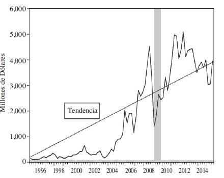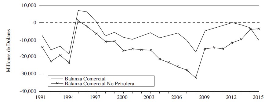 Elaboración propia con datos de inegi (BIE) y Banco de México.En efecto, esta tendencia negativa de largo plazo ha consistido en una continua y acelerada reducción del superávit de la balanza comercial petrolera (BCP), en especial en el periodo 2004-2014, precisamente cuando los precios del petróleo iniciaron su camino hacia los 100 USD por barril, y se ha agravado y hecho evidente a partir del segundo semestre de 2014, cuando los precios del petróleo comenzaron su acelerado descenso hacia los 50 dólares por barril.