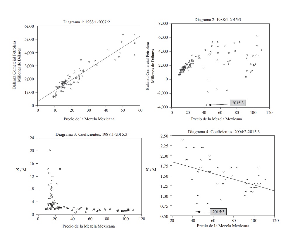En el primer diagrama de dispersión se observa que desde 1988 hasta el segundo trimestre de 2007 (2007:2), los incrementos del precio del petróleo crudo se relacionaban de forma positiva con el saldo neto de la balanza comercial petrolera (BCP). Sin embargo, en el diagrama de dispersión 2, cuando se considera el periodo 1988-2015, se observa que la anterior relación positiva entre la BCP y los precios de la mezcla mexicana se rompe durante el periodo 2007:3 - 2015:3. Es decir, estas dos series muestran una relación que, aunque dispersa, indica claramente una tendencia hacia valores cada vez más negativos del saldo de la BCP, lo cual parecería paradójico dado el incremento en el valor de las exportaciones de crudo y la política de incremento mensual a los precios de la gasolina y el diésel que se inició en 2007. El tercer trimestre de 2015 (2015:3), en el cual se reportó un saldo negativo de la BCP de alrededor de $3,685 millones de dólares, corrobora totalmente esta tendencia decreciente de la BCP, la cual, de acuerdo al mismo segundo diagrama de dispersión, ya se venía observando desde que los precios rondaban los 100 dólares por barril.