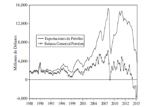 Una clara señal de esta tendencia se puede explicar por las diferentes velocidades de crecimiento entre las exportaciones petroleras (principalmente petróleo crudo) y las importaciones de productos petrolíferos, gas natural y petroquímicos. En efecto, en el periodo 1988 – 2014 el valor de las exportaciones petroleras en dólares corrientes tuvo una tasa media anual de crecimiento del 7.12% mientras que, para el mismo periodo, el valor de las importaciones de productos petrolíferos, gas natural y petroquímicos, también en dólares corrientes, reportó una tasa media anual de crecimiento del 18.8%.[2] Este diferencial de crecimiento entre las exportaciones e importaciones del sector petrolero muestra que, si bien los altos precios del petróleo han generado un importante incremento en los ingresos de divisas por concepto de exportaciones de petróleo crudo, este remanente de divisas ha sido sustancialmente reducido por el crecimiento acelerado de las importaciones de productos petrolíferos, de gas natural y petroquímicos.