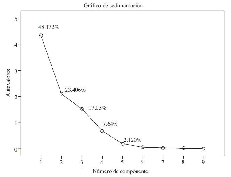 Una medida importante de confiabilidad es el grado de representación de los resultados en cada una de las dimensiones sujetas a ser consideradas; ya que cada dimensión va a representar las variables de análisis en mayor o menor medida, donde generalmente las primeras dimensiones representan una mayor proporción de la varianza, esto se expresa claramente en la gráfica de sedimentación (ver figura 1), ya que muestra la proporción de la varianza explicada por cada componente.