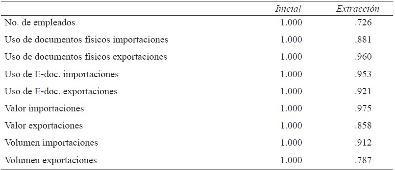 De tal forma que, como se puede observar en la tabla 1 que las variables que mejor se representan en la dimensión 1 son valor de exportaciones, valor de importaciones, volumen de importaciones y volumen de exportaciones. La dimensión 2 por su parte engloba a las variables de número de empleados, uso de documentos electrónicos para importaciones y uso de documentos electrónicos para exportaciones. Finalmente, la dimensión 3 representa las variables de uso de documentos físicos para importaciones y uso de documentos físicos para exportaciones (véase tabla 1).