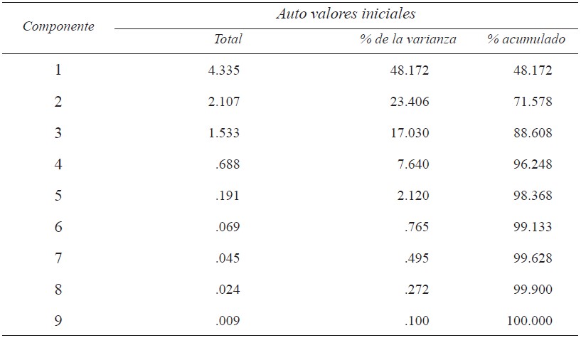 Como se observa en la figura 1, el primer componente representa 48.172% del total de la varianza, por su parte el segundo componente muestra un 23.406% de la varianza, mientras que el tercer componente representa un 17.03% de la varianza, por lo que en suma estos tres componentes representan un total de 88.608% de la varianza para el presente estudio.