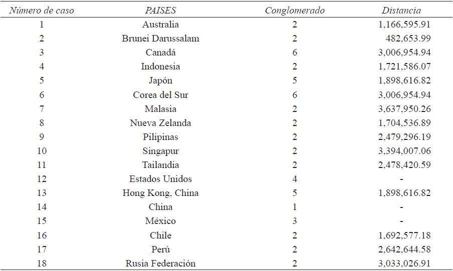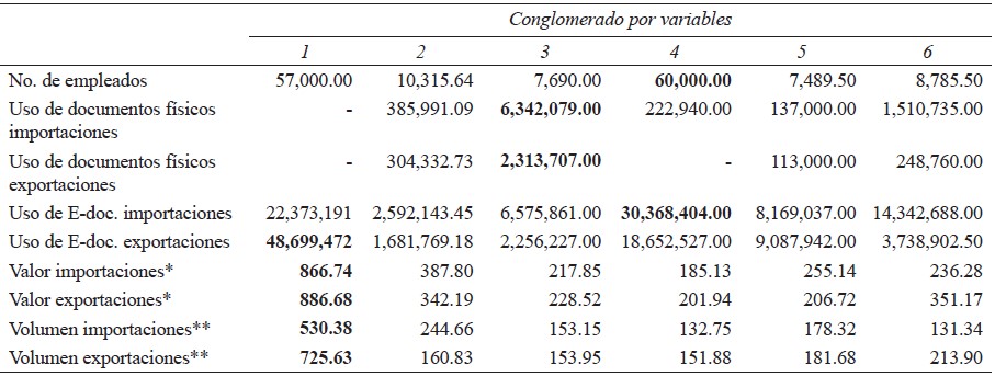 Como se observa en la tabla 3 las aduanas de los países analizados se agrupan en 6 conglomerados diferentes. En el primer conglomerado se ubica únicamente un país siendo este China, la característica de este conglomerado es el más alto nivel de uso de documentos electrónicos para las exportaciones, el más alto nivel de exportaciones e importaciones tanto en volumen como el valor de las mismas. El hecho de que China sea el único país ubicado en este conglomerado sugiere la enorme distancia en términos de flujo de comercio respecto de los demás países aun cuando el año del estudio es 2015 es decir, justo cuando China vive un proceso de desaceleración comercial respecto del nivel de comercio de ese mismo país en años anteriores. Destaca también el hecho de que es el único conglomerado que no usa documentos físicos ni en exportaciones ni en importaciones para el proceso de despacho aduanero lo que sugiere que le dé una ventaja competitiva respecto de las otras aduanas en cuanto a la agilidad del proceso de despacho.