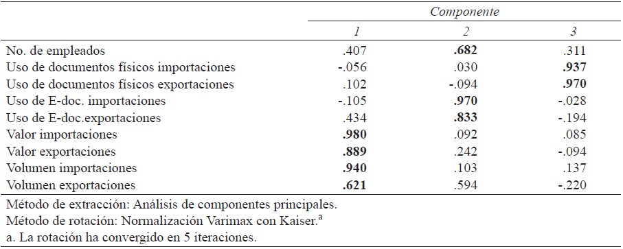 Los primeros resultados del análisis efectuado se obtienen de la matriz de componentes rotados, dicha matriz permite ver en qué componente se realiza la mayor carga factorial de cada una de las variables analizadas a fin de comprender la relación entre los casos (en esta investigación las aduanas de los países) y las variables y a su vez la relación entre variables. Cabe señalar que el máximo valor alcanzable en la matriz de componentes rotados es 1 siendo el menor valor cero, para que un valor se considere como representado adecuadamente en un componente debe ser mayor a 0.500.