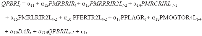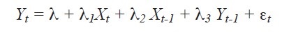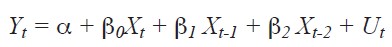 El modelo de ecuaciones simultáneas usado, fue compuesto por modelos de rezagos distribuidos, en los que para explicar la respuesta de las variables dependientes (Y) a un cambio unitario de las variables explicativas (X) no solo se consideraron sus valores actuales, sino también los rezagados o anteriores