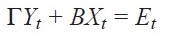 donde: Yt = Vector de variables endógenas del modelo; Xt= Vector de variables predeterminadas, más la ordenada al origen; Γ = Matriz de parámetros estructurales asociados a las variables endógenas; Β = Matriz de parámetros estructurales asociados a las variables predeterminadas; E = Vector de los términos de error aleatorios. Los vectores Yt y Et son de orden M X 1, donde M es el número de variables endógenas del modelo. Por su parte, Γ es una matriz cuadrada de orden M X M. A su vez, Β es una matriz de orden K + 1 X M, donde K es el número de variables exógenas y endógenas retrasadas del modelo más la ordenada al origen; en general, K puede o no ser igual a M. Al existir la inversa de Γ, es posible derivar el modelo reducido del sistema:
