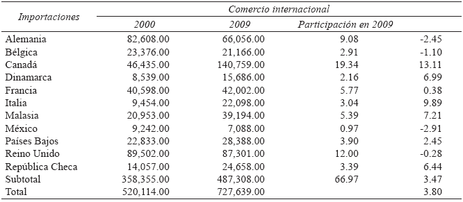 Durante el 2009 el comercio internacional de coliflor y brócoli se desarrolló como sigue, las exportaciones de los diez países más importantesascendieron a las 842 mil toneladas, lo que representó un 88.3% del total mundial y un 4.2% de la producción; el principal exportador durante ese año fue España con 25.38%, seguido por Francia (16.54%), México (11.01%), Estados Unidos (9.42%), China (6.22%) y Ecuador (5.77%). El valor de las exportaciones mundiales ascendió a los 964.8 millones de dólares. Los cinco principales países importadores en 2009 fueron Canadá, Reino Unido, Alemania, Francia y Malasia, que en conjunto alcanzaron las 375 mil toneladas (51.58% de las importaciones totales), demandando 19.34%, 12%, 9.08%, 5.77% y 5.39%, respectivamente. Las importaciones mexicanas de coliflor y brócoli representaron, durante el año citado, un 0.97% del total mundial y en el periodo de 2000 a 2009 decrecieron a una TCMA de 2.9%. A nivel mundial las importaciones de coliflor y brócoli crecieron, durante el periodo citado, a un ritmo de 3.8% anual, siendo el país con la mayor tasa de crecimiento Canadá (13.11%), seguido de Italia (9.89%), Dinamarca (6.99%) y República Checa (6.44%), mientras que Alemania registró un decremento en sus importaciones de 2.45%; en suma, las importaciones mundiales alcanzaron las 728 mil toneladas y un valor de 788.7 millones de dólares (FAO, 2012).