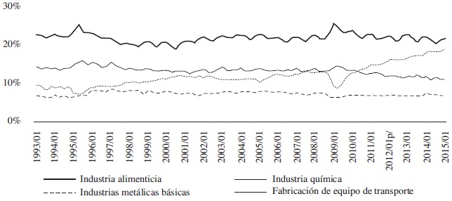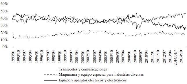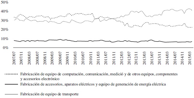 Al interior del sector de maquinaria y equipo una de las ramas de exportación más dinámicas es el sector productor de equipo de transporte, concentrando alrededor del 40% del total de las exportaciones durante el periodo de estudio con una tendencia creciente en su participación a partir de 2008 (ver Gráfica 7). Con respecto a su participación dentro del pIB manufacturero, muestra una tendencia creciente dentro del total de la manufactura, pues pasa del 10% en 1993 a casi el 20% en 2015, lo que refleja la creciente importancia de este sector exportador dentro de la industria (ver gráfica 8).