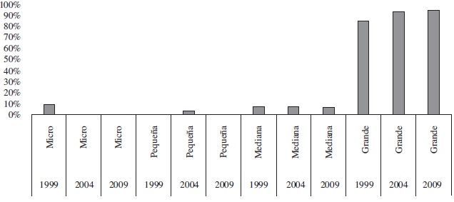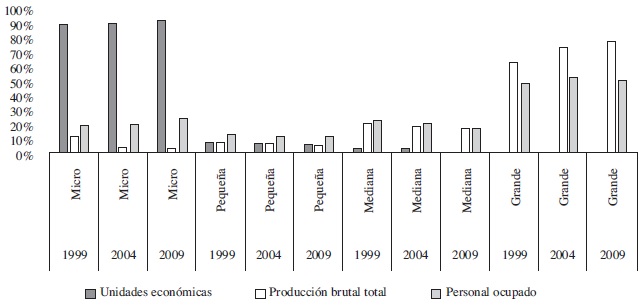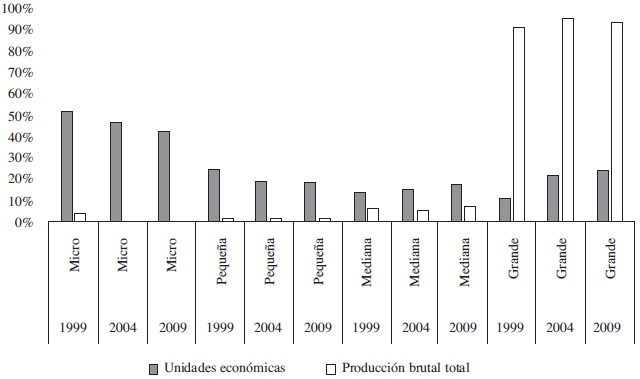 Mientras que la microempresa representa alrededor del 90% de las unidades económicas, la empresa grande representa el 1% del total. Sin embargo esta última, concentra el 77% de la producción con una tendencia creciente durante el periodo de análisis, mientras que la micro, pequeña y mediana presentan una caída en la participación de la producción durante el mismo periodo (ver Gráfica 10).