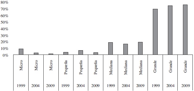 En la misma tónica, la diferencia de la inversión fija bruta entre los distintos tamaños de empresa es avasalladora. Como se observa en la Gráfica 14, la proporción de formación bruta de capital fijo para la empresa grande es creciente como porcentaje del total durante el período de análisis y representaba en 2009 el 93% del total. Caso contrario, el de la micro, pequeña y mediana empresa que no alcanzan de manera conjunta ni el 7% de la misma para el mismo año.
