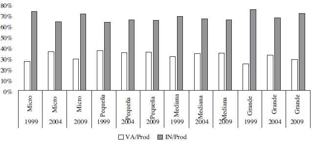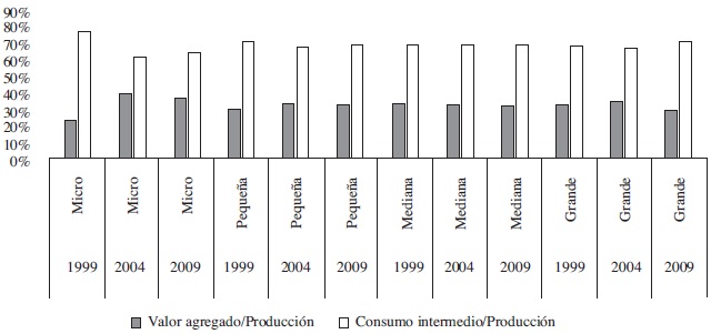 En términos de valor agregado e insumos intermedios la siguiente gráfica expresa, con algunas aristas interesantes, la dependencia de los diferentes estratos de empresa respecto a los insumos intermedios.
