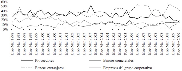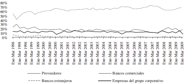 En ambas gráficas, la ventaja financiera de las grandes empresas es evidente al contar con mayores alternativas de financiamiento respecto a las pequeñas,20 las cuales en su mayoría recurren al financiamiento de proveedores, el cual ha sido en promedio del 63% durante el período, mientras que para las AAA21 fue del 33%. En lo referente al crédito bancario, para las pequeñas empresas este ha sido en promedio alrededor del 17%, mientras que para las grandes lo fue del 33%. Vale la pena destacar que el crédito comercial a las empresas es bajo, en cualquier estrato, fundamentalmente porque bajo el manejo financiero actual,22 para los bancos comerciales son más rentables otras actividades financieras (inversiones en valores, crédito al consumo e hipotecario) que las crediticias al sector productivo. Aunado a ello, el papel de la banca de desarrollo se ha desdibujado casi por completo en el financiamiento a la actividad productiva dentro del sistema económico (al ser en promedio durante el periodo de estudio del 2.33% para las pequeñas y del 2.49% para las grandes, según datos de Banco de México).