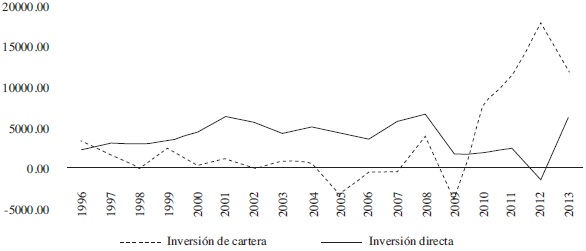 Durante el periodo largo que abarca las tres décadas de implantación del modelo exportador, a excepción del periodo de restructuración (1980-1990) y el de crisis bancaria y devaluación (1994-1995), la balanza comercial ha sido deficitaria. De aquí que sea necesaria la entrada de capital para compensar este desequilibrio. Para ello se ha optado por una política monetaria que mantenga un diferencial de tasa de interés atractivo conjuntamente con la privatización de empresas públicas, reformas estructurales y condiciones fiscales preferenciales para el capital externo, lo que ha garantizado un flujo continuo de inversión externa como se observa en la Gráfica 2.