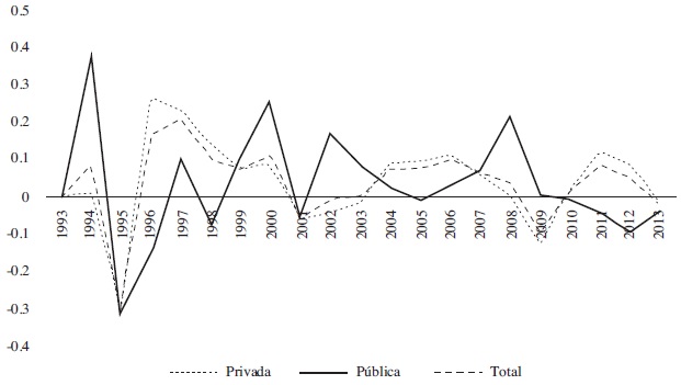 El ingreso del capital externo (IED e Inversión de cartera) ha permitido financiar el déficit de la balanza comercial y administrar el tipo de cambio con el objetivo de mantener la inflación estable, sin embargo como puede observarse, a partir de 2009 se ha incrementado el flujo de inversión de cartera, lo que hace inestable la estrategia, dada la naturaleza de este tipo de inversión.16 Asimismo, la inversión extranjera directa no ha tenido un efecto significativo sobre la formación de capital a nivel macroeconómico. Cómo se muestra en la Gráfica 3, la tasa de crecimiento de la formación bruta de capital fijo (privada y pública) presenta una tendencia descendente durante todo el periodo, evidenciando la poca efectividad de la política de atracción de capital en el crecimiento del país.