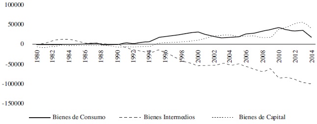 Durante el periodo largo, es claro el cambio estructural de la balanza comercial a partir de la década de los noventa, en donde se comienza a tener superávit en la cuenta de bienes de consumo y de capital, pero se profundiza la dependencia externa de bienes intermedios que en términos globales hace deficitaria la balanza comercial. Esto también expresa a nivel macro el resultado de la estrategia exportadora. La inversión extranjera se ha establecido en ciertos sectores de la industria manufacturera, específicamente en el sector productor de bienes de capital, maquinaria y equipo, con una estrategia de ganancia predominantemente maquiladora lo que se relaciona directamente con la dependencia de insumos intermedios que se observa en la Gráfica 5.