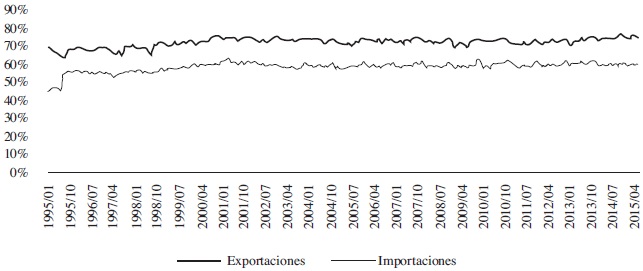 Dentro de la industria manufacturera, el sector productor de maquinaria y equipo es el que más exporta al concentrar alrededor del 70% de las exportaciones del total de la industria durante el periodo. Sin embargo, también concentra el mayor porcentaje de importaciones, el cual es de alrededor del 60% para el mismo periodo (Gráfica 6).